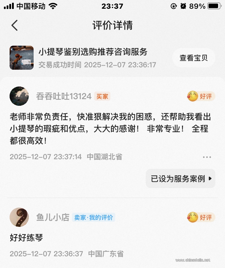 『提琴鉴别咨询导购服务』可直接闲鱼拍下或加微信(qimingvp)后发提琴信息或购买意向给我,协助您购买到喜欢的提琴。 版主: 鱼儿 |